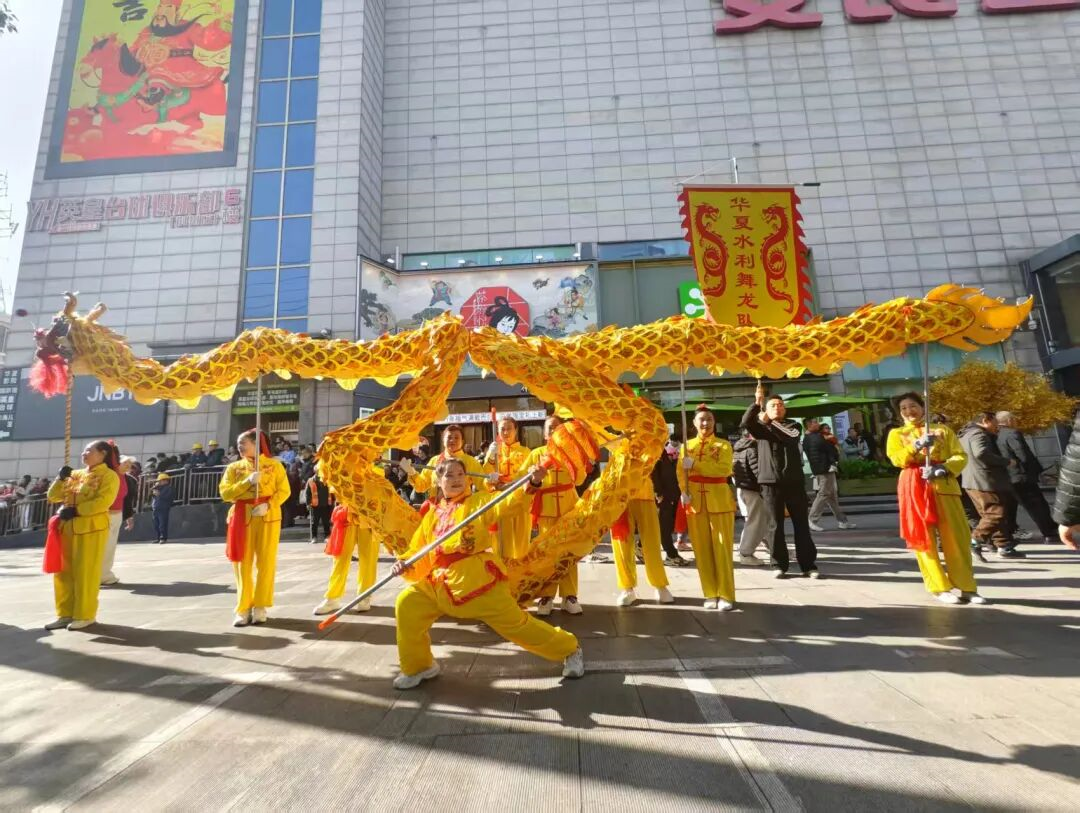 湖北華夏水利受邀組建并冠名的舞龍隊(duì)精彩參演?;顒蝇F(xiàn)場,公司舞龍隊(duì)隊(duì)員們配合默契,巨龍騰躍翻飛,精彩的表演贏得了現(xiàn)場觀眾的連連喝彩,成為民俗活動中的一道亮眼風(fēng)景線。